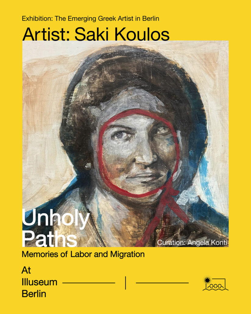 Diese Ausstellung ist ein Akt der Würdigung und des Erinnerns, verwurzelt in persönlichen und familiären Geschichten. Als Enkelkind griechischer und italienischer Arbeiter:innen, die nach Norden migrierten, um in Fabriken und Bergwerken zu arbeiten, reflektiert Saki Koulos über das Leben jener Menschen, die für ihre Familien eine bessere Zukunft suchten. Diese Geschichten weiten sich zu kollektiven Erzählungen aus, die zwischen den Zeilen dominanter Narrative häufig verborgen bleiben.